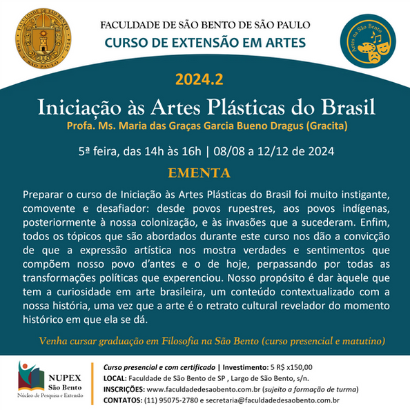 Preparar o curso de Iniciação às Artes Plásticas do Brasil foi muito instigante, comovente e desafiador. Desde povos rupestres, ao povo indígena, posteriormente a nossa colonização, e as invasões que a sucederam. Enfim, todos os tópicos que são abordados durante este curso nos dão a convicção de que a expressão artística nos mostra verdades e sentimentos que compõem nosso povo d’antes e o de hoje perpassando por todas as transformações políticas que experenciou. Sendo assim, nosso propósito é dar, àquele que tem a curiosidade em arte brasileira, um conteúdo contextualizado com a nossa história, uma vez que a arte é o retrato cultural revelador do momento histórico em que ela se dá. Em nosso trabalho, podemos classificar de maneira clara e objetiva, como se deu a nossa arte junto aos povos que aqui viviam, aliados a uma educação praticamente de observação dos mestres-obreiros de “aprendizado” autodidatas no oficio a que se propunham, principalmente na arquitetura, com uma dedicação bem mais comprometida na edificação, copiando em princípio a do povo originário, bem como depois a do colonizador e do estrangeiro que aqui vinha estudar e ensinar. Entretanto, a nossa estatuária e pintura se desenvolvem de um modo bastante peculiar.